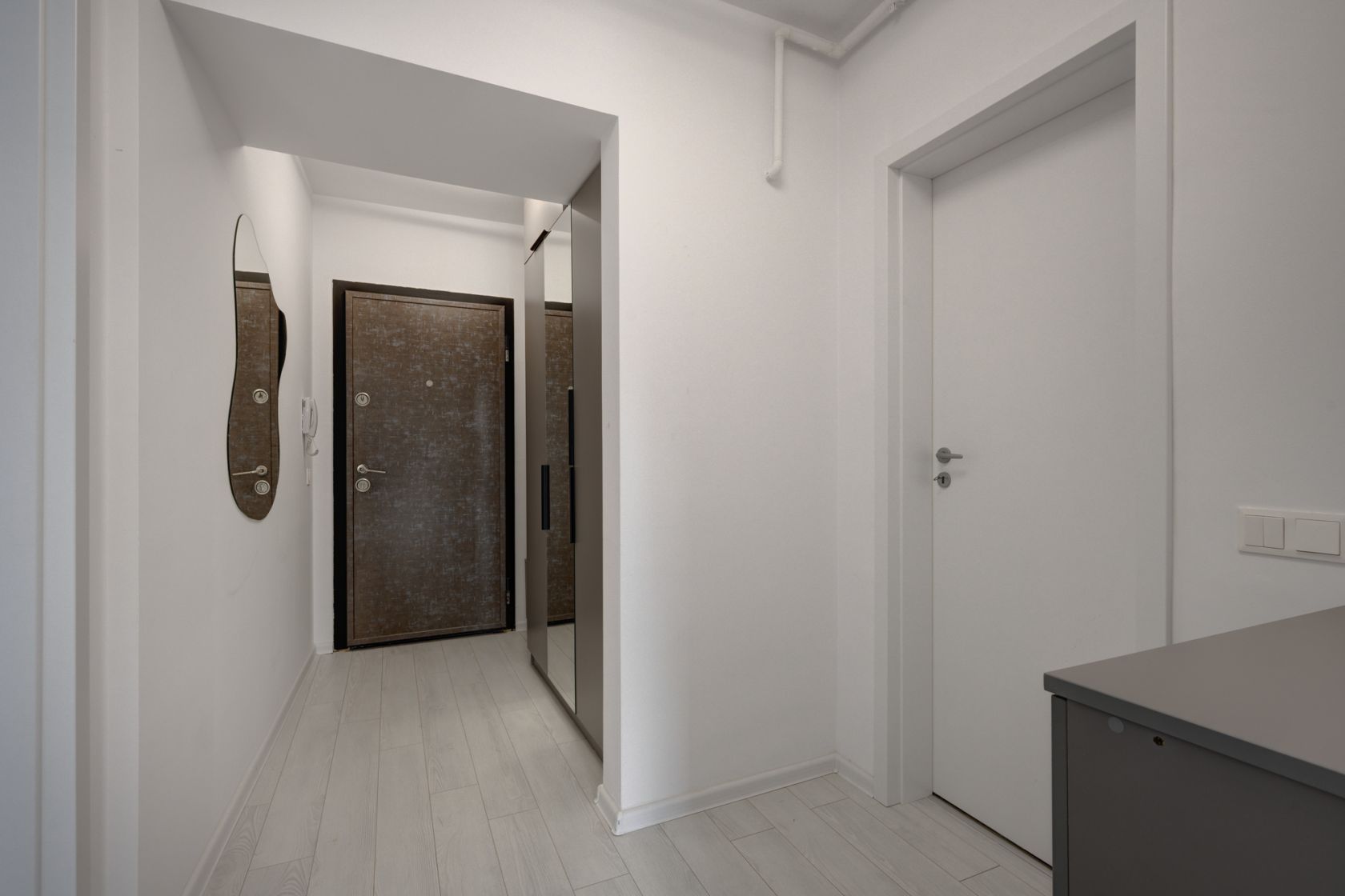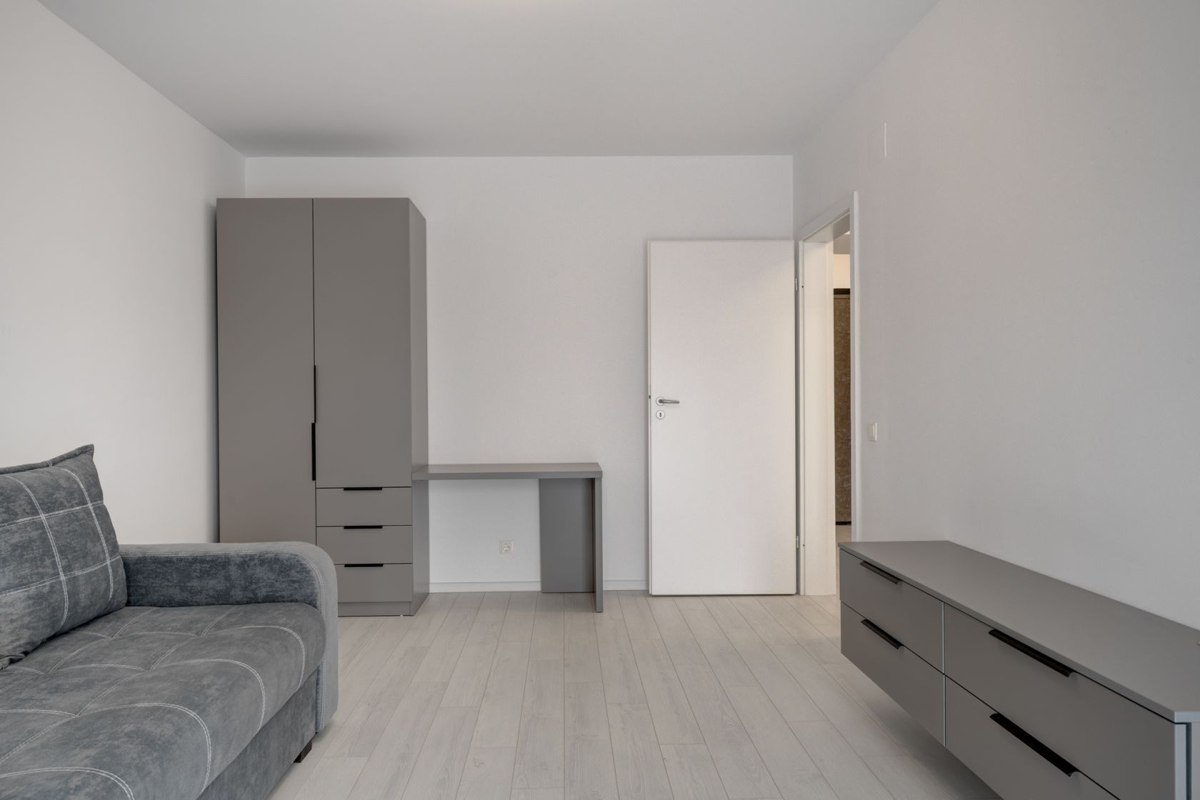 Holul de la intrare este spatios si amenajat cu un dulap generos( dressing) pentru haine. Camera este amenajata cu o canapea extenisbila, comoda cu TV si inca un dressing generos.