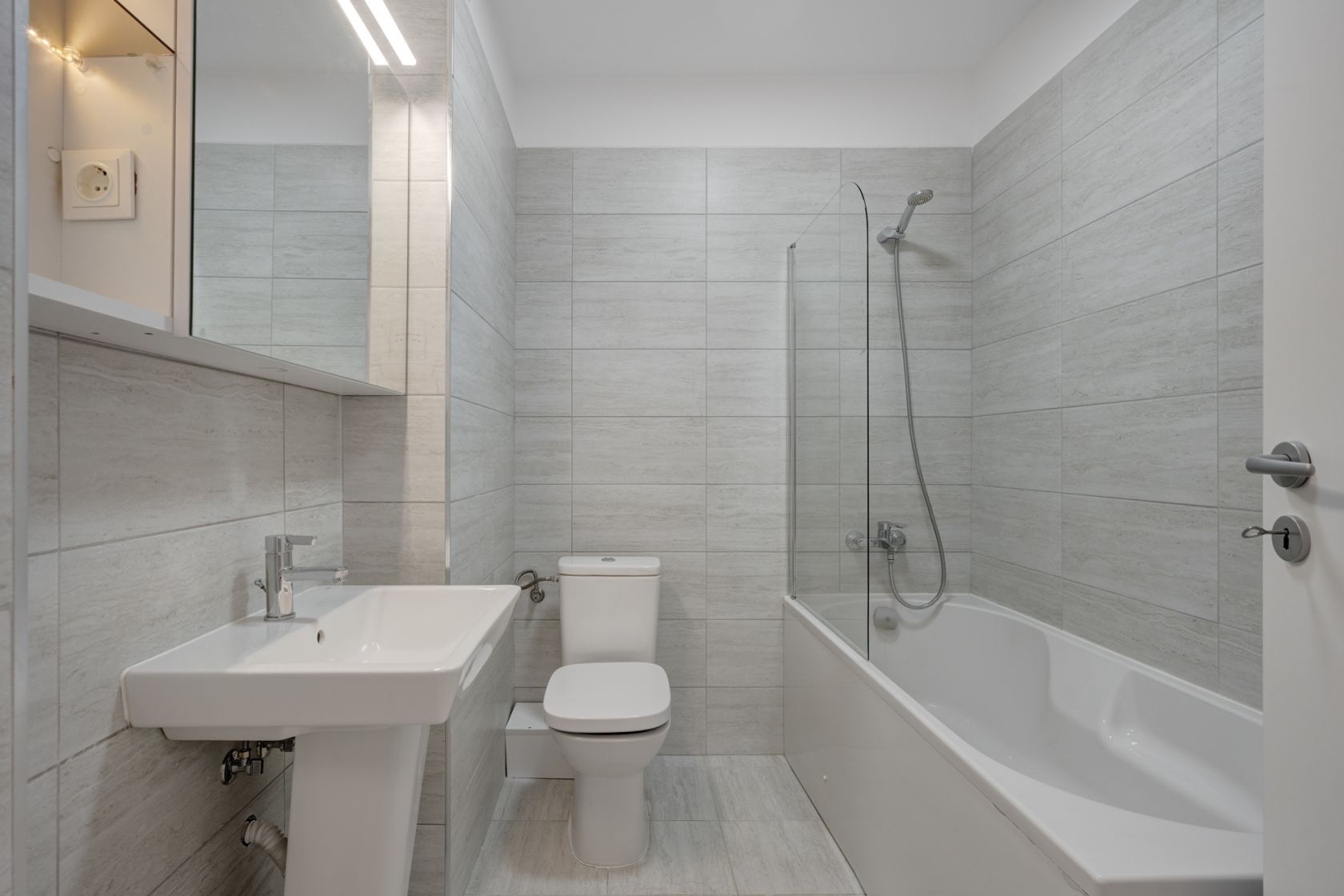 Bucataria este complet mobilata si utilata cu toate electricasnicele necesare: plita, cuptor, hota, masina de spalat vase, frigider, cuptor cu microunde. Baia este complet echipata cu obiecte sanitare, dotata cu cada si masina de spalat rufe.