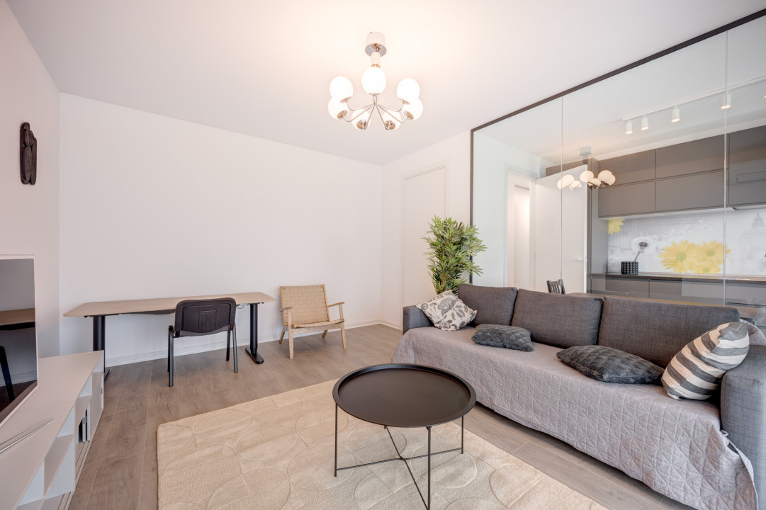 Va prezint spre inchiriere un apartament cu 2 camere, in suprafata total utila de 57.5 mp situat la etajul 5, in ansamblul Cloud9 Pipera.